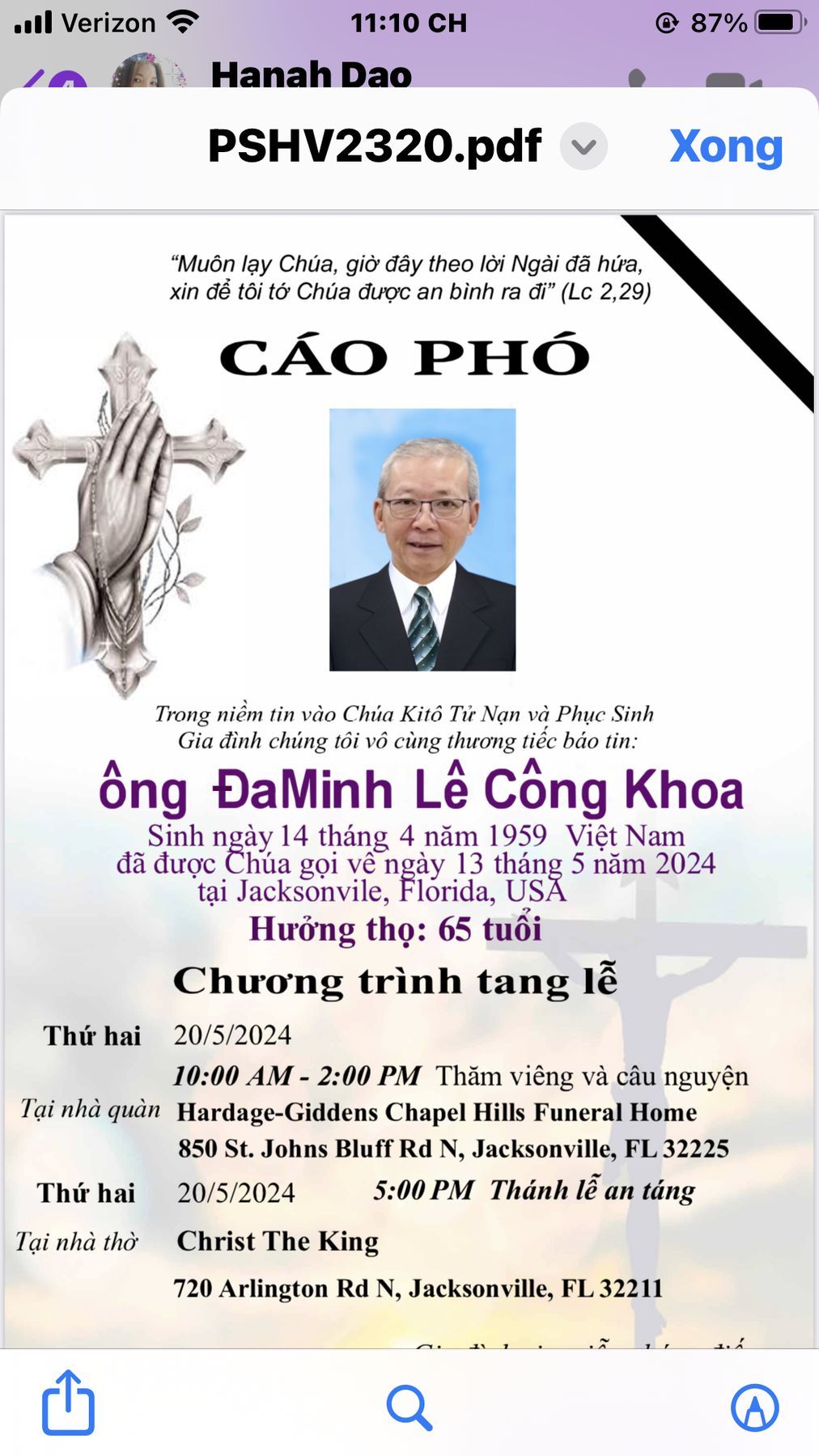 A visitation for ÐA MINH will be held Monday, May 20, 2024 from 10:00 AM to 2:00 PM at Hardage-Giddens Chapel Hills Funeral Home, 850 St Johns Bluff Road North, Jacksonville, FL 32225. Following the visitation will be a mass of christian burial from 5:00 PM to 6:00 PM at Christ the King Catholic Church, 742 Arlington Rd N, Jacksonville, FL 32211.