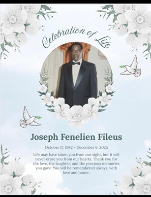 Joseph Fenelien Fileus, age 83, was born on October 17, 1942, in Fabias, a small community in Marchand-Dessalines, L’Artibonite, Haiti. He was the third of five children born to Fenelus Fileus and Jes...