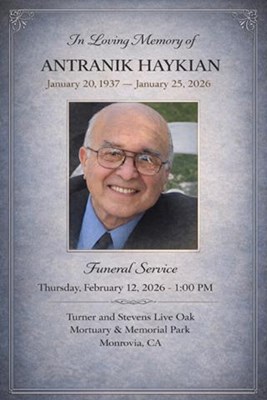 Antranik H. Haykian, born on January 20, 1937, passed away on January 25, 2026, at the age of 89. A funeral service will be held at Turner & Stevens-Live Oak Mortuary, located at 200 E Duarte Road, ...