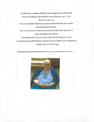 Caroline Perry, 91 of Henrico, went to be with her Lord and Savior, Jesus Christ, on Saturday, June 1, 2019. She was a resident of Manor Care Nursing Home on Hilliard Road. She was preceded in death b...
