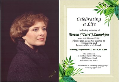Teresa "Terri" Lumpkins, age 70, resident of Ridgefield, Washington and former resident of Columbus, passed away on February 27, 2018. A Celebration of Life Service will be held on Sunday, September ...