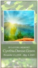 Cynthia Lynn Green, age 66, of Memphis, Tennessee passed away on Sunday, April 7, 2024. A visitation for Cynthia will be held Thursday, April 18, 2024 from 4:00 PM to 7:00 PM at M.J. Edwards Funeral...