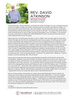 If you knew Rev. David Atkinson, you knew his smile, his laugh, his way of always having a story to relate to make you smile. You also knew his concern and care for others. In the words of his best fr...
