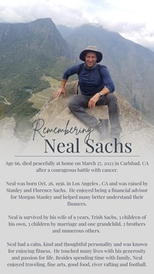 Age 66, died peacefully at thome on March 27, 2023 in Carlsbad, CA after a courageous battle with cancer. Neal was born Oct. 26, 1956. in Los Angeles, CA and was raised by Stanley and Florence Sachs....