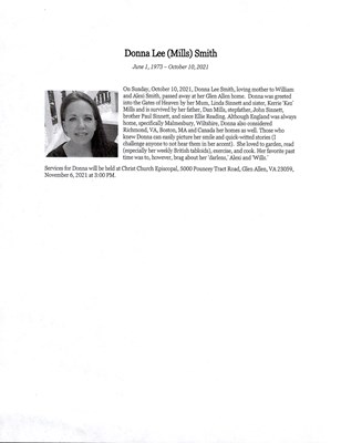 On Sunday, October 10, 2021, Donna Lee Smith, loving mother to William and Alexi Smith, passed away at her Glen Allen home. Donna was greeted into the Gates of Heaven by her Mum, Linda Sinnett and s...