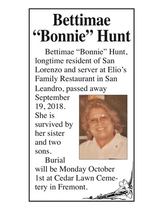 Bettimae (Bonnie) Hunt, longtime resident of San Lorenzo and server at Elio's Family Restaurant in San Leandro, Ca. passed away on Wednesday September 19, 2018. She is survived by her sister and two...