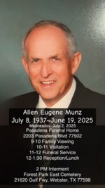 Allen Eugene Munz Born July 8, 1937 Died June 19, 2025 Allen Eugene Munz, a respected resident of Pasadena, Texas, passed away on June 19, 2025, at the age of 87. He was born on July 8, 1937, to p...