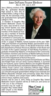Jane a lifelong resident of Mobile, AL., graduated Murphy High School in 1953. She attended Hollins College in Roanoke, VA, the University of AL, and graduated from Springhill college in 1992. A memb...