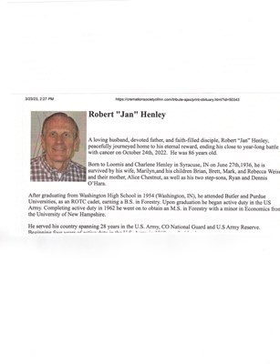 Robert “Jan” Henley A loving husband, devoted father, and faith-filled disciple, Robert “Jan” Henley, peacefully journeyed home to his eternal reward, ending his close to year-long battle with cancer...