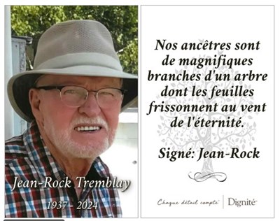 Le 17 décembre est décédé paisiblement à son domicile entouré de l’amour des siens, à l’âge de 87 ans, M. Jean-Rock Tremblay, époux de feu Mme Rachel Lespérance. Il était le fils de feu M. Georges-Art...