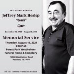 Jeffrey Mark Heslep, 60, of Houston, Tx, unexpectedly passed away on August 8, 2021 after complications during post-operative recovery. Born on December 10, 1960, in Arlington, Tx to James Joseph H...