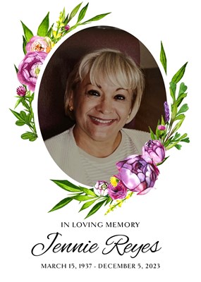 Jennie Reyes, age 88, of Chino, California passed away on Thursday, March 9, 2023. Jennie will be laid to rest in Rose Hills Memorial Park, 3888 Workman Mill Rd, Whittier, California 90601; Garden o...