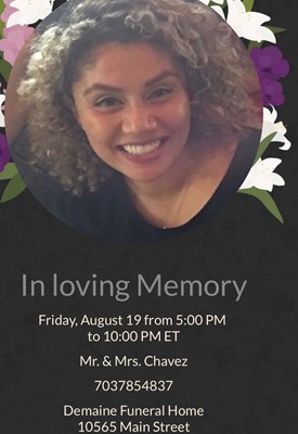 Jessica Trixie Chavez, age 38, of Alexandria, Virginia passed away on Tuesday, August 16, 2022. Jessica was born August 13, 1984 in Washington, D.C.. A visitation for Jessica will be held Friday, Au...