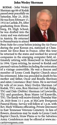 KODAK - John Wesley Sherman age 88 of Kodak passed away peacefully on Saturday, May 23, 2020. He was born February 17, 1932 in Carlisle, PA. After graduating from Ebensburg, PA High School, he was dra...