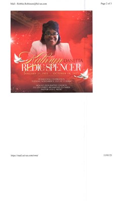 Kathryn Danetta Redic-Spencer, age 66, of Oakland, California passed away on Monday, October 18, 2021. Kathryn was born January 21, 1955, the daughter of Adolphia Dan and Lottie Mae Boney Redic. At th...