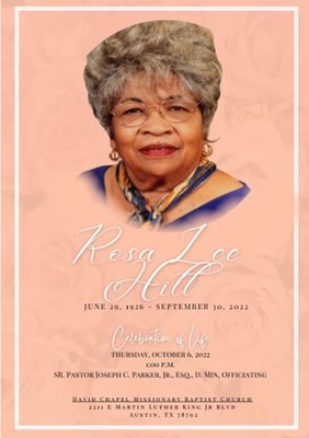Rosa Lee Campbell was born June 29, 1926, to Hubert and Parilee Washington Campbell (McLennan County) in Rosenthal, Texas. She was the youngest child of 11 siblings, and attended school in Lorena, Tex...