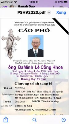 ÐA MINH LÊ CÔNG KHOA, age 65 passed away on Monday, May 13, 2024. ÐA MINH was born in Ho Chi Minh City, Vietnam. A visitation for ÐA MINH will be held Monday, May 20, 2024 from 10:00 AM to 2:00 PM a...