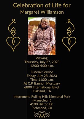 Margaret Irene Williamson, age 71, of Oakland, California passed away on Wednesday, July 12, 2023. A public viewing will be held at C.P. Bannon 6800 International Blvd Oakland,CA on Thursday July 27...