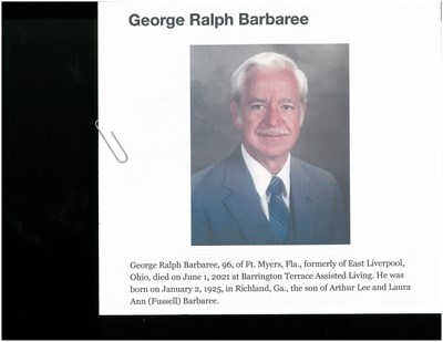 George Ralph Barbaree, 96, of Ft. Myers, Fla., formerly of East Liverpool, Ohio, died on June 1, 2021 at Barrington Terrace Assisted Living. He was born on January 2, 1925, in Richland, Ga., the son o...