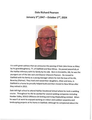 It is with great sadness that we announce the passing of Dale (also known as Bikey by his granddaughters), 77, of Oakfield and New Minas. He passed peacefully at the Halifax Infirmary with his family ...