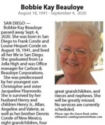 Barbara "Bobbie" was born in San Diego on October 3, 1938. She spent her whole life living in San Diego County, moving to El Cajon in the 60s. Bobbie was a licensed foster mom for over 50 years caring...