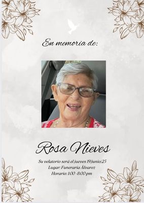 Rosa Nieves Álvarez de 91 años, residente de Bayamón, Puerto Rico. Ha partido el 16 de Junio de 2025. Rosa nació en Bayamón, Puerto Rico el 21 de junio de 1933. Le sobreviven sus hijos, quienes se e...