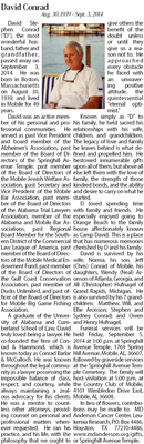 David Stephen Conrad ("D"), the most wonderful husband, father and grandfather, passed away on September 3, 2014. He was born in Boston, Massachusetts on August 30, 1939, and lived in Mobile for 49 ye...
