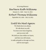 Wesley Thomas Williams Jr., age 89 passed away on Wednesday, January 1, 2025. Wesley was born in Texas. A visitation for Wesley will be held Thursday, January 16, 2025 from 3:00 PM to 5:00 PM at Rei...