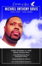 Michael Anthony Davis 41, of Indianapolis, passed away on October 28, 2020, in Indianapolis, Indiana. At an early age he was baptized in the name of Jesus Christ at New Zion Tabernacle Church. Micha...