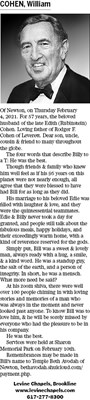 William Cohen of Newton, on Thursday February 4, 2021. For 57 years, the beloved husband of the late Edith (Rubinstein) Cohen. Loving father of Rodger F. Cohen of Leverett. Dear son, uncle, cousin & f...