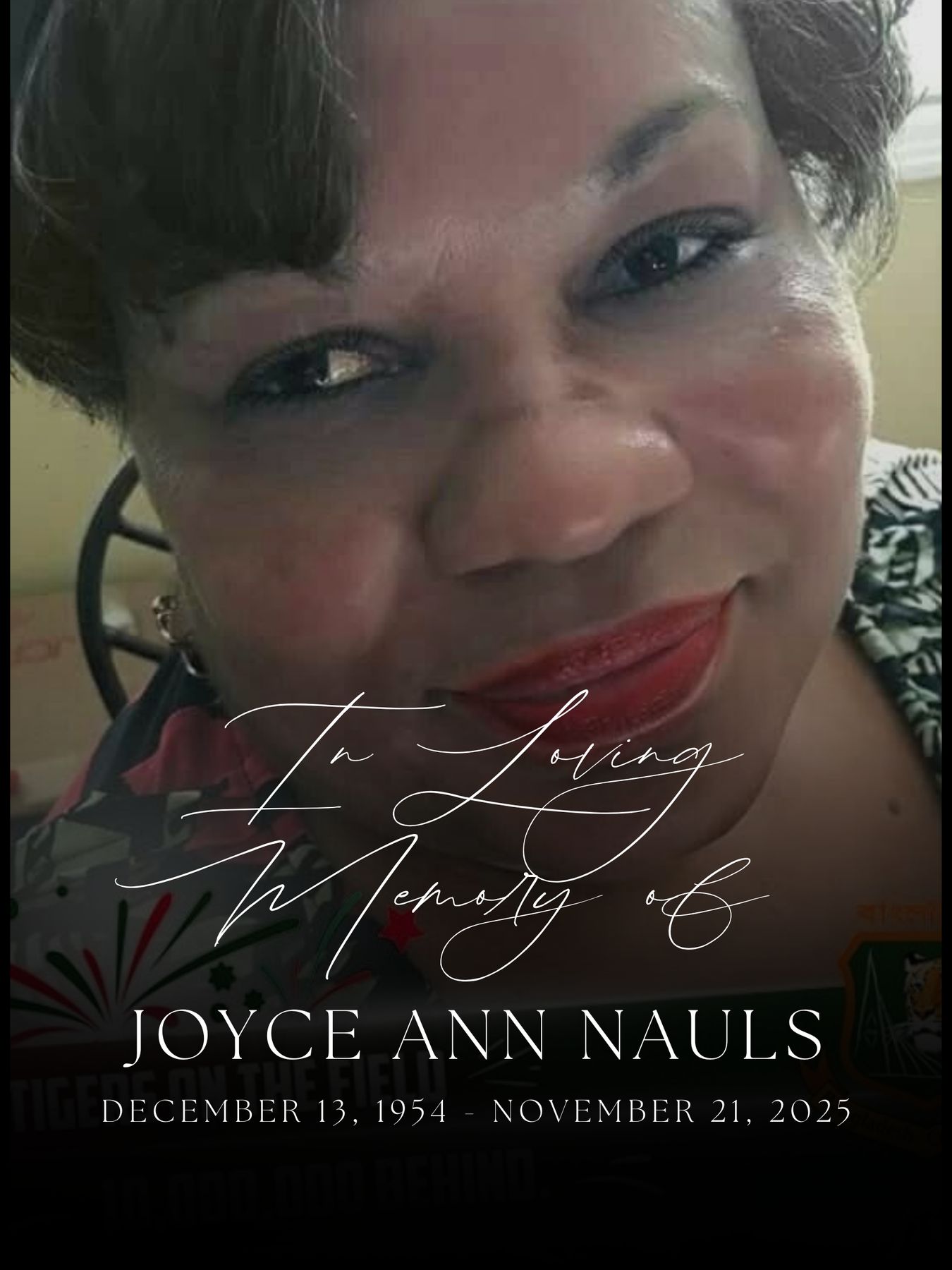 Joyce will be deeply missed by her family, including her mother Gertie B. Nauls, her son Ladawn D Nauls, also known as Don, her sisters Juanita Johnson, Jeanette Smith, and LaWanda Johnson, her brother-in-law Stanley Smith, her brother-in-law Boris Johnson, her nephew Dezra Nauls, her nieces Traci Fuller and Kimberly Qrais, and Ahmad Qrais, and other beloved family members, including her aunt Mable Jackson and uncle Ardis Hall.