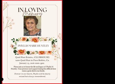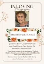 In Loving Memory of our dear sweet mom, Phyllis Huntley. Obituary It is with profound sadness that we announce the passing of Phyllis Huntley. She was at her home surrounded by family on January 4, 2...