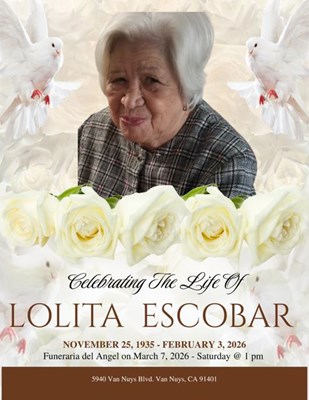 Lolita M. Escobar passed away on February 3, 2026, at the age of 90. Born on November 25, 1935, Lolita resided in PANORAMA CITY, California. A Memorial Service will be held at Funeraria del Angel V...